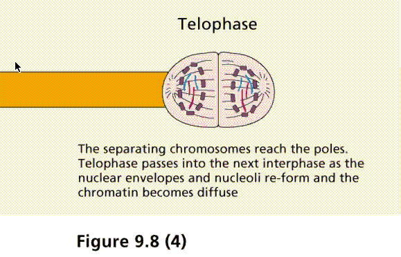 Telophase is when the chromosomes reach the poles of their respective spindles, the nuclear envelope reforms, chromosomes uncoil into chromatin form, and the nucleolus (which had disappeared during Prophase) reform. Where there was one cell there are now two smaller cells each with exactly the same genetic information. These cells may then develop into different adult forms via the processes of development.