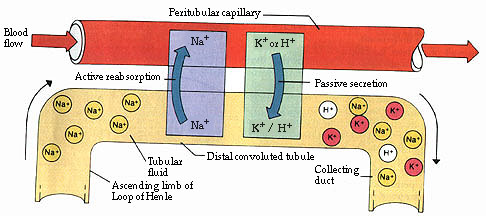 Although most of the potassium ions in the glomerular filtrate are actively reabsorbed in the proximal convoluted tubule, some may be secreted passively in the distal segment and collecting duct. During this process, the active reabsorption of sodium ions out of the fluid produces a negative electrical charge within the tube. Because the positively charged potassium ions (K+) and hydrogen ions (H+) are attracted to regions that are negatively charged, these ions move through the tubular epithelium and enter the tubular fluid.