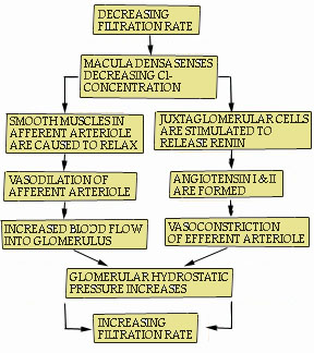 The regulation of glomerular filtration rate involves the juxtaglomerular apparatus, which was described previously, and two negative feedback mechanisms. These mechanisms are triggered whenever the filtration rate is decreasing. For example, as the rate decreases, the concentration of chloride ions reaching the macula densa in the distal convoluted tubule also decreases. In response, the macula densa signals the smooth muscles in the wall of the afferent arteriole to relax, and the vessel becomes dilated. This action allows more blood to flow into the glomerulus, increasing the glomerular pressure, and as a consequence, the filtration rate rises toward its previous level.