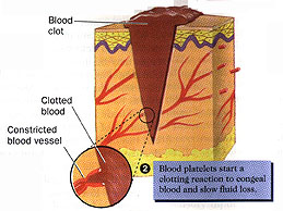 Phase 1: The blood vessels in the surrounding tissue constrict, reducing the flow of blood at the injury. Specialized cells in the blood, called platelets, release chemicals causing proteins in the blood to form a mesh-like network. The mesh traps blood cells, forming a blood clot that plugs the torn blood vessels. Another group of cells, mast cells, release histamine, which attracts phagocytic white blood cells. This initiates inflammation, which allows for combating any infection that may arise.