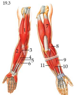 3. Locate the following muscles in the manikin and models. Also locate in your own body as many muscles as you can: trapezius, rhomboideus, levator scapulae, pectoralis minor, pectoralis major, teres major, latissimus dorsi, supraspinatus, deltoid, subscapularis, infraspinatus, teres minor, biceps brachii, triceps brachii, supinator, pronator teres, pronator quadratus, flexor carpi radialus, flexor carpi ulnaris, flexor digitorum, extensor carpi radialis, extensor carpi ulnaris, extensor digitorum. List these muscles along with their origins, insertions and actions
