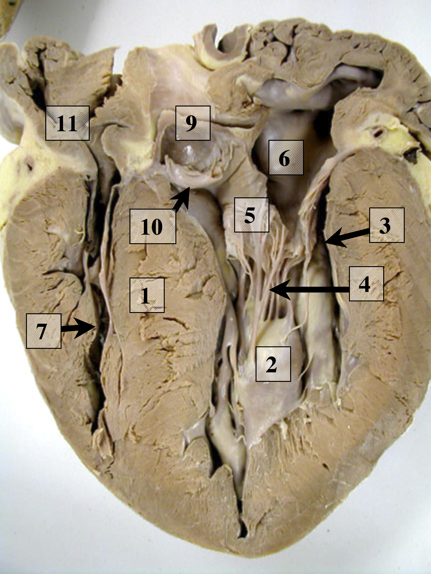 5. Continue with your cutting by extending it through the wall of the RIGHT ventricle to the apex. Open the ventricle and identify the chordae tendineae and papillary muscles.