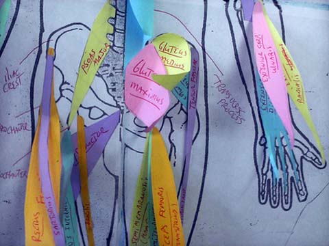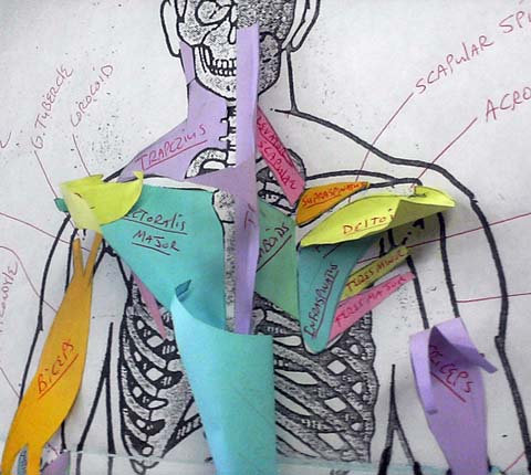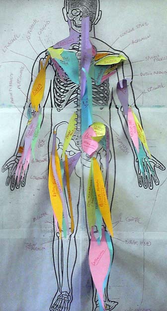 Your goal is to create a miniature model of the body showing the location of the muscles of the body. Using your labs, color sheets and flash cards as a reference, you will cut out muscles from the colored sheets of paper and add them to your ÒPosterÓ. It is important that you place them in the correct places on the body, attaching them to the proper condyles, etc. You will label the muscles and then list the actions in the margins of your papers. Take care to get the correct lengths, widths, and shapes as you cut out your muscles. Also be sure to note the Òlayering orderÓ of muscles so you place them down correctly.