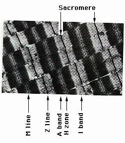 Each sacromere is made up of a complex arragement of proteins. Two of these proteins are actin and myosin. Myosin filaments lie primarily within dark bands seen within muscle cells, a region called A bands, while actin filaments are primarily within the lighter bands of the sacromere. These lighter bands are called I bands. Where the individual actin filaments attach to one another is a dark line, the Z line, which appears within the I band. It is the distance between Z lines that defines any one sacromere. Within the A band is a lighter region, the H band, which is an area of only myosin. A thin line within this region, formed by connections between myosin filaments if the M line. As we'll see, the molecular interaction between the two directly lead to muscle contraction. |