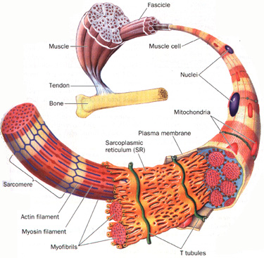 Each muscle is composed of parallel bundles of individual muscle cells. Each cell is surrounded by a delicate connective tissue called the endomysium, which connects the individual muscle cells together. Bundles of these cells, called fascicles are wrapped in another layer of connective tissue, the perimysium, which holds the bundle together, defining the fascicle. Many fascicles are wrapped in yet a third tissue, the epimysium making a single muscle. Each muscle is wrapped by a another sheath of connective tissue called a fascia, which supports and holds the entire muscle together , seperating it from other muscles. These connective tissue wrappings are actually continuous with each other, meeting at the end of the muscle where they unite to form an extremely tough, fibrous connective tissue material called a tendon. Tendons attach muscle to bone by intertwining with the fibers of the periosteum of the bone.