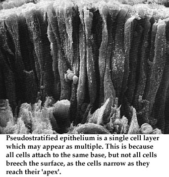 Pseudostratified Columnar: This type of epithelium appears to be stratified,