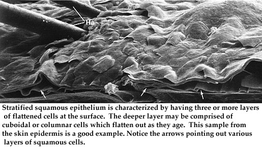 The number of cell layers and the shape of the cells is a tip off to the function of the epithelial tissue. The two basic functions of epithelium is the control of materials moving through the epithelium and protection of underlying tissue layers. Simple epithelium, with it's single layer is found primarily in organs whose function is diffusion, filtration, secretion, or absoption. The alveoli in the lungs (diffusion), the tubules of the kidney (filtration), the many glands of the body (secretion), and the lining of the intestine (absorption) are all excellant examples of the movement of materials being controlled by a layer of epithelium. Stratified tissue would hinder such movement by the nature of it's many layers, thus it's use as a protective layer. As damage is done to outer layers, the lower layers replace those cells which were damaged. The skin, anus and vagina are all examples of organs with stratified tissue.