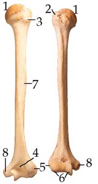 1. Head 2. Greater Tubercle 3. Lesser Tubercle 4. Olecranon fossa 5. Lateral Epicondyle 6. SKIP 7. Deltoid Tuberosity 8. Medial Epicondyle |