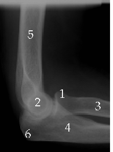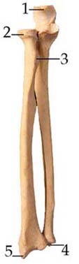 1. Olecranon 2. Head of Radius 3. Radial Tuberosity 4. Styloid process 5. Styloid process |