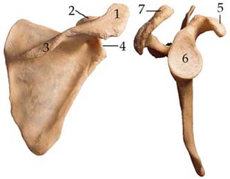 1. Acromion 2. Corocoid process 3. Spine 4. Glenoid fossa (cavity) 5. Corocoid process 6. Glenoid fossa (cavity) 7. Acromion |
