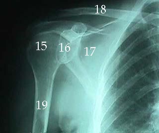 1. Acromion 2. Head of Humerus 3. Corocoid process 4. Clavicle 5. Sternum 6. Cartilage (costal) 7. Rib (true) 8. Humerus 9. Scapula |