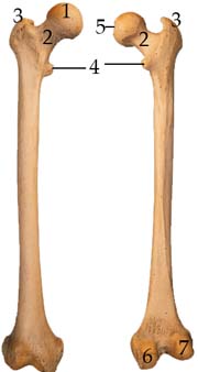 1. Head of Femur 2. Neck (SKIP) 3. Greater Trochanter 4. Lesser Trochanter 5. Head (Fovea Capitis) 6. Medial Condyle 7. Lateral Condyle |