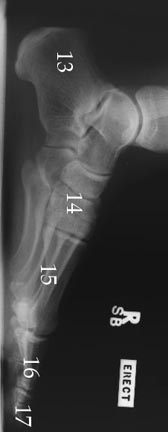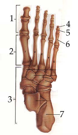 1. Phalanges 2. Metatarsals 3. Tarsals 4. Distal Phalanges 5. Middle Phalanges 6. Proximal Phalanges 7. Calcaneus |