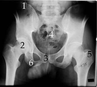 1. Iliac Crest 2. Head of Femur/Acetabulum 3. Pubic Symphysis 4. Sacrum 5. Greater Trochanter 6. Ischium 7. Femur 13. Calcaneus |